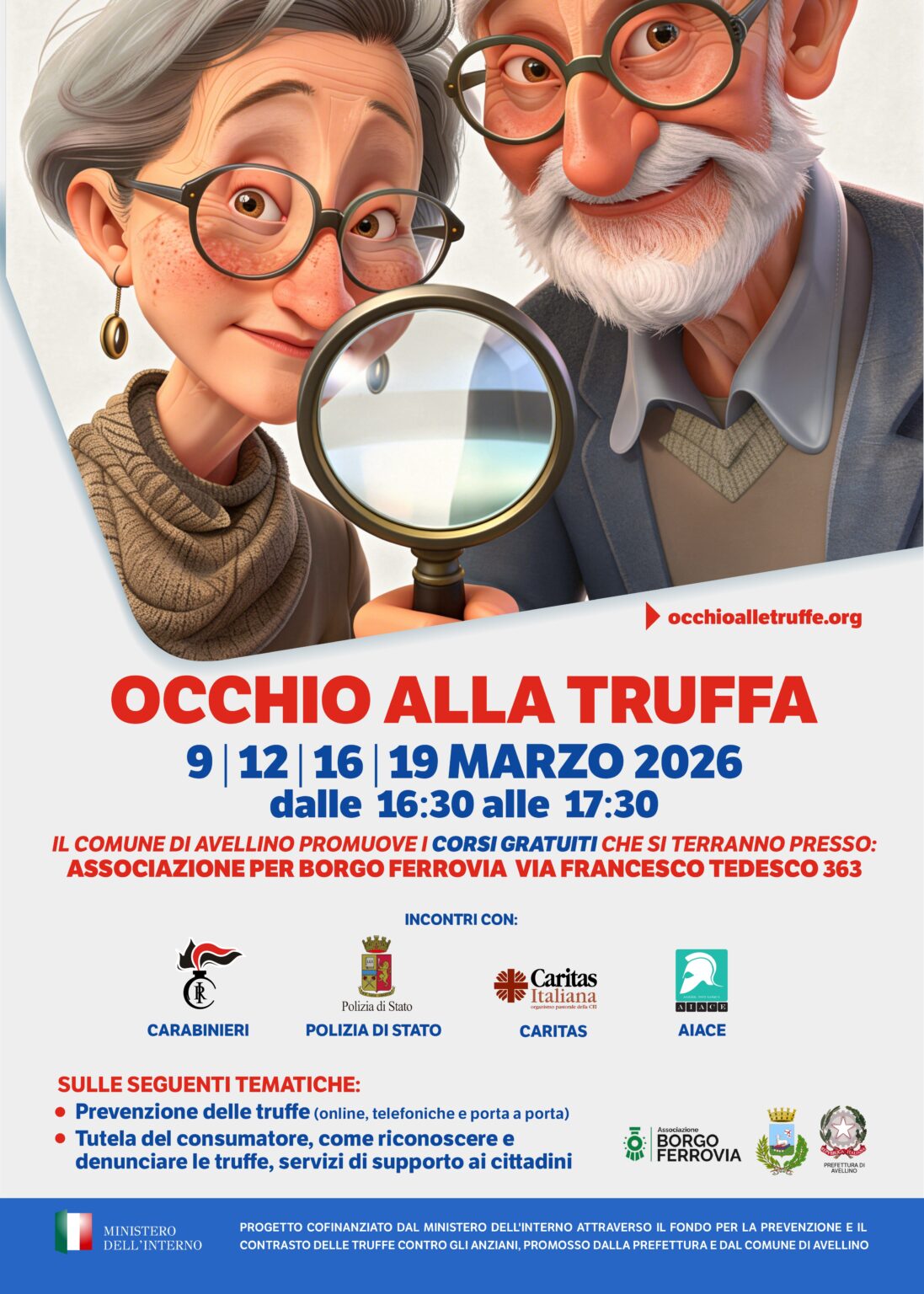 Al via i corsi di formazione del progetto “Occhio alla Truffa”, promosso dal Comune di Avellino, in collaborazione con la Prefettura. L’iniziativa è dedicata alla prevenzione e al contrasto dei raggiri ai danni dei cittadini, in particolare delle persone over 65. Il ciclo di incontri ha l’obiettivo di fornire strumenti concreti per riconoscere e prevenire le truffe più diffuse, dalle frodi online a quelle telefoniche e porta a porta, promuovendo una maggiore consapevolezza sulle modalità di denuncia e gli strumenti digitali.